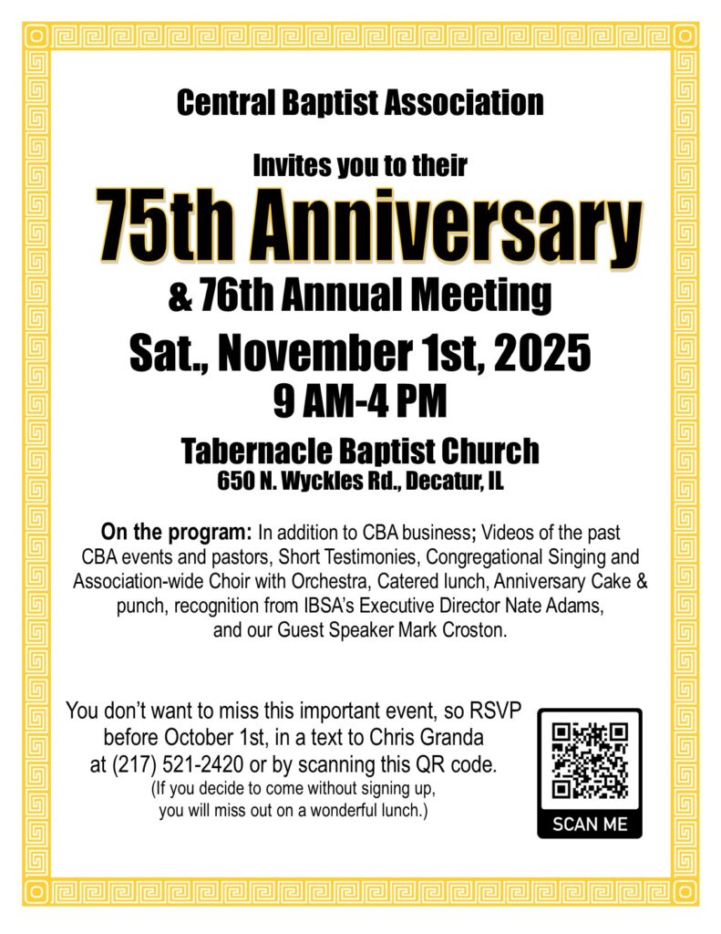 Tabernacle Baptist Church in Decatur will host their CBA Business meeting with videos of past CBA events and pastors,