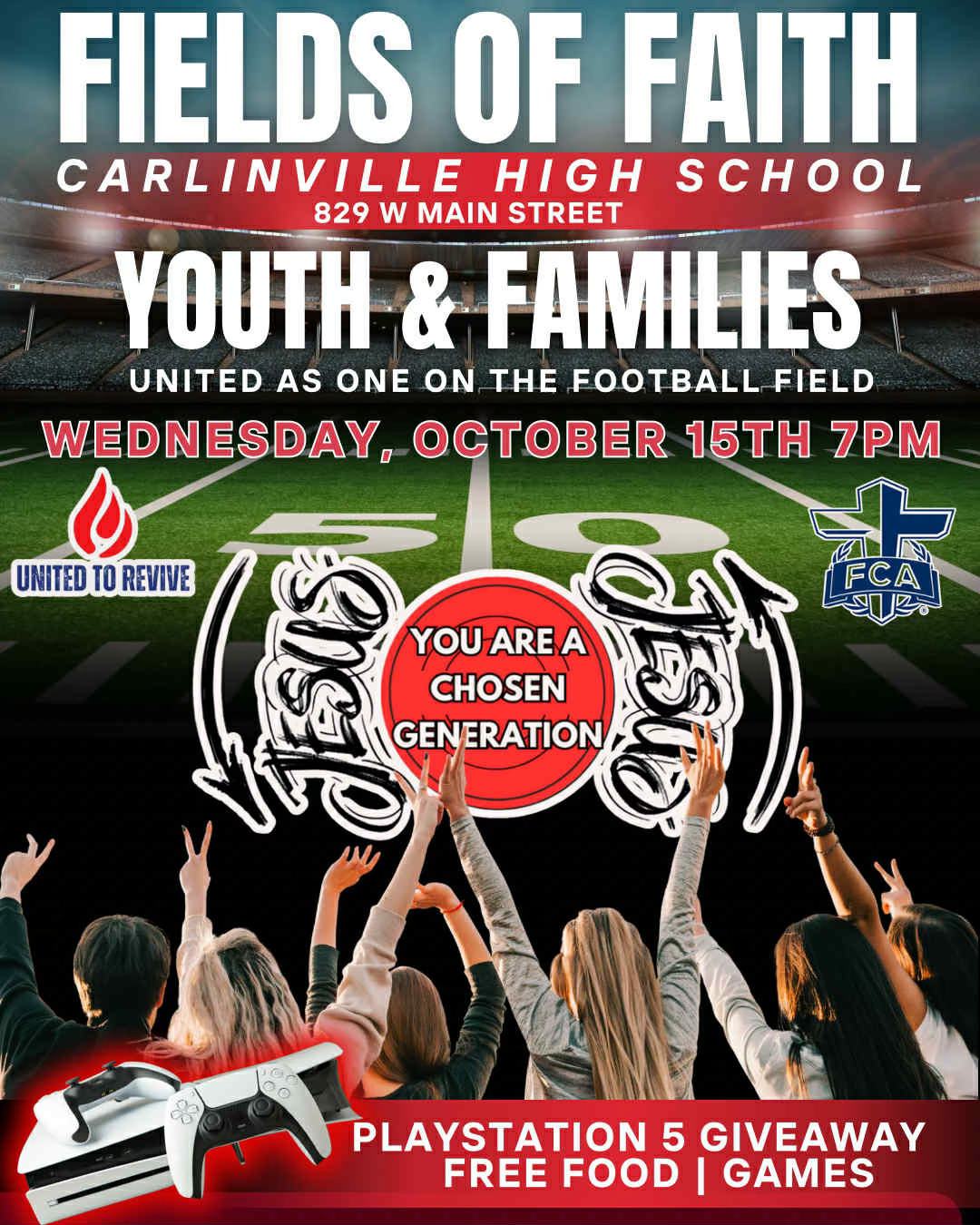 Fields of Faith is a night for students by students. This year we will be at Carlinville HS on the football field starting at 7:00 pm. There will be a free meal, worship and testimonies from students, and a giveaway of a PS5 to a student in attendance. Thanks to United to Revive Ministries and Fellowship of Christian Athletes for sponsoring this event.